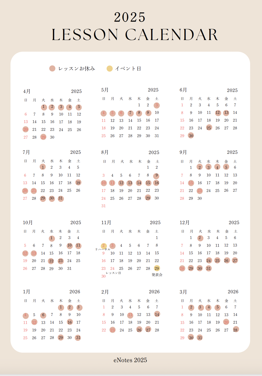 ※年間40回/月3〜4回のレッスン(カレンダーに準ずる)